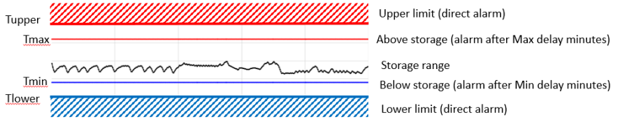 - Tlower: When this temperature (below Tmin) is reached, direct and alarm e-mail and SMS is send.