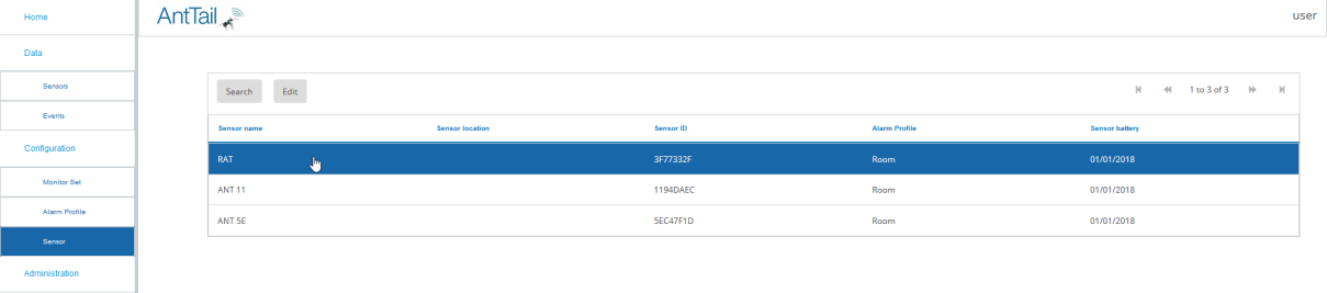 3. Structure The AntTail monitor service consists of 3 main choices: 1. Data. The sensor temperature data and the event data can be shown. Under sensors, the stored sensor data can be shown in graphs and can be exported. Events are logged timestamps ...