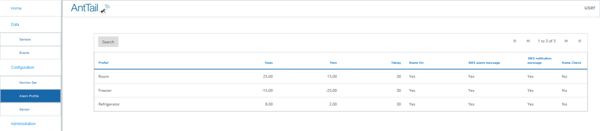Configuration consist of three pages, Monitor Set, Alarm profile and Sensor configuration.