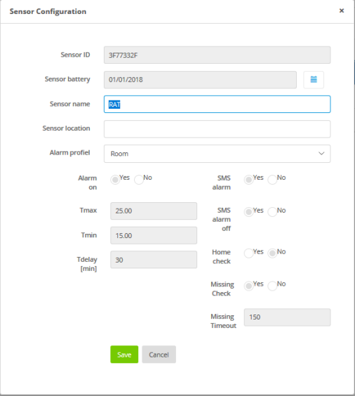- Missing Check: flag indicating if warning e-mail is sent when the sensor is not read out by any gateway or gateway app during missing timeout minutes (missing timeout is configured in alarm profile)