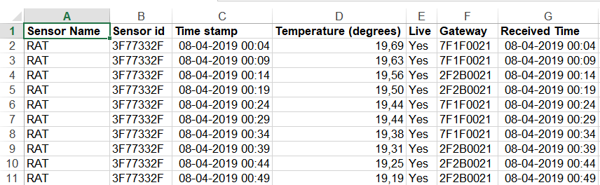 2. Export: Export shows an export page, you can select if an Excel or CSV file should be exported. Sensor name, sensor ID, time and temperature are exported. Also, the gateway via which the sample is received, the receive time and a Boolean indicating if the reading was live are stored. The exported file can be saved via the web browser file download. The file name consists of a generated key name. After download, the user can rename the file.