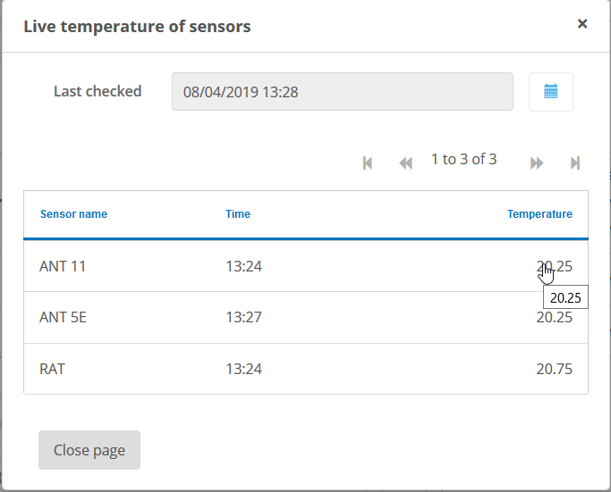When the button ‘Actual Status' is selected, a pop-up window appears. This window shows the actual (last) temperature value of all sensors of the user. This window is automatically refreshed every minute and closed by itself after one hour. When no temperature is shown after the sensor, the sensor is currently not active or not in the range of a gateway.